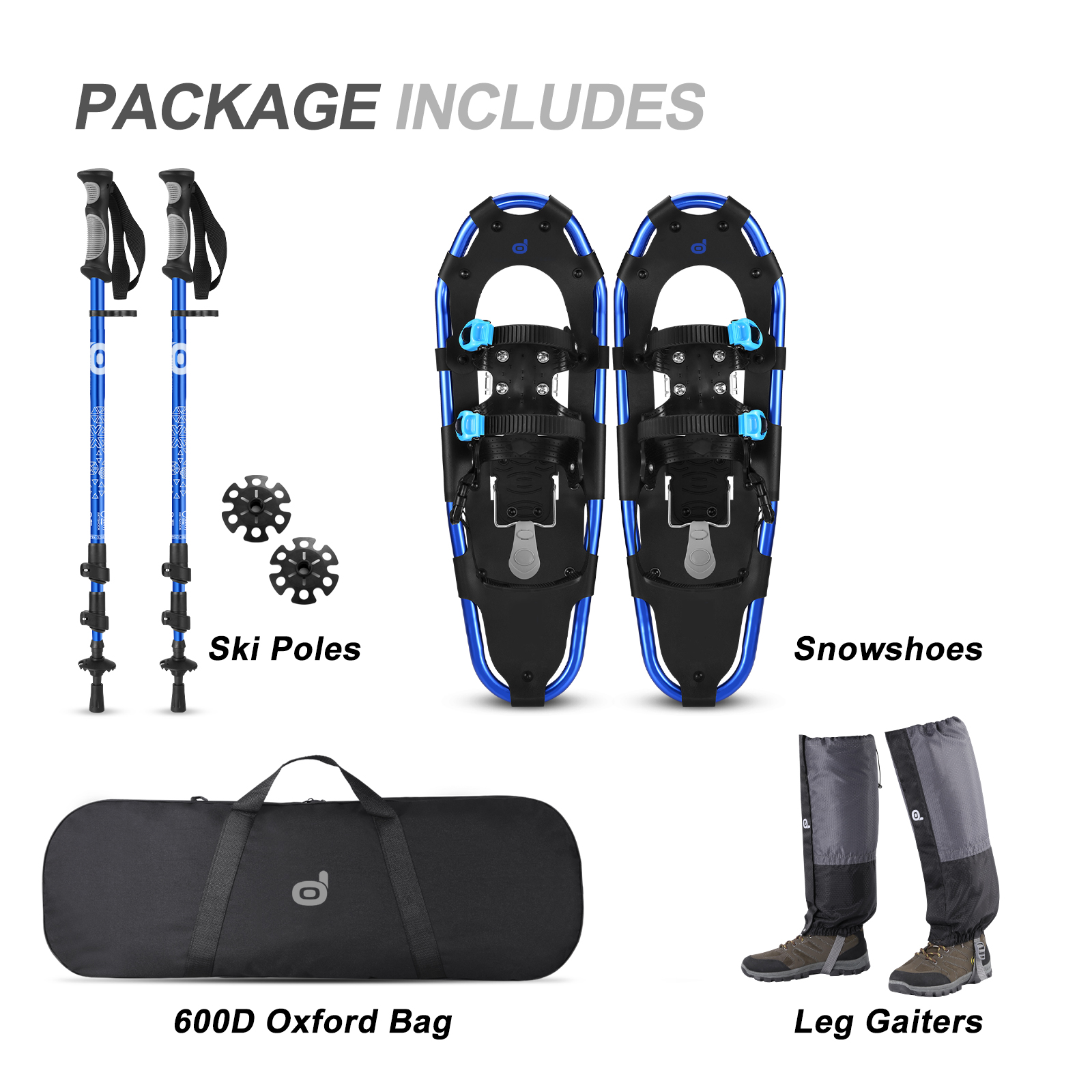 d 4-in-1 Snowshoes for Men Women Youth Kids with Trekking Poles, Waterproof Snow Leg Gaiters and Carrying Tote Bag, Lightweight Snow Shoes Easy to Wear Aluminum Alloy, Size 21”/25”/30”