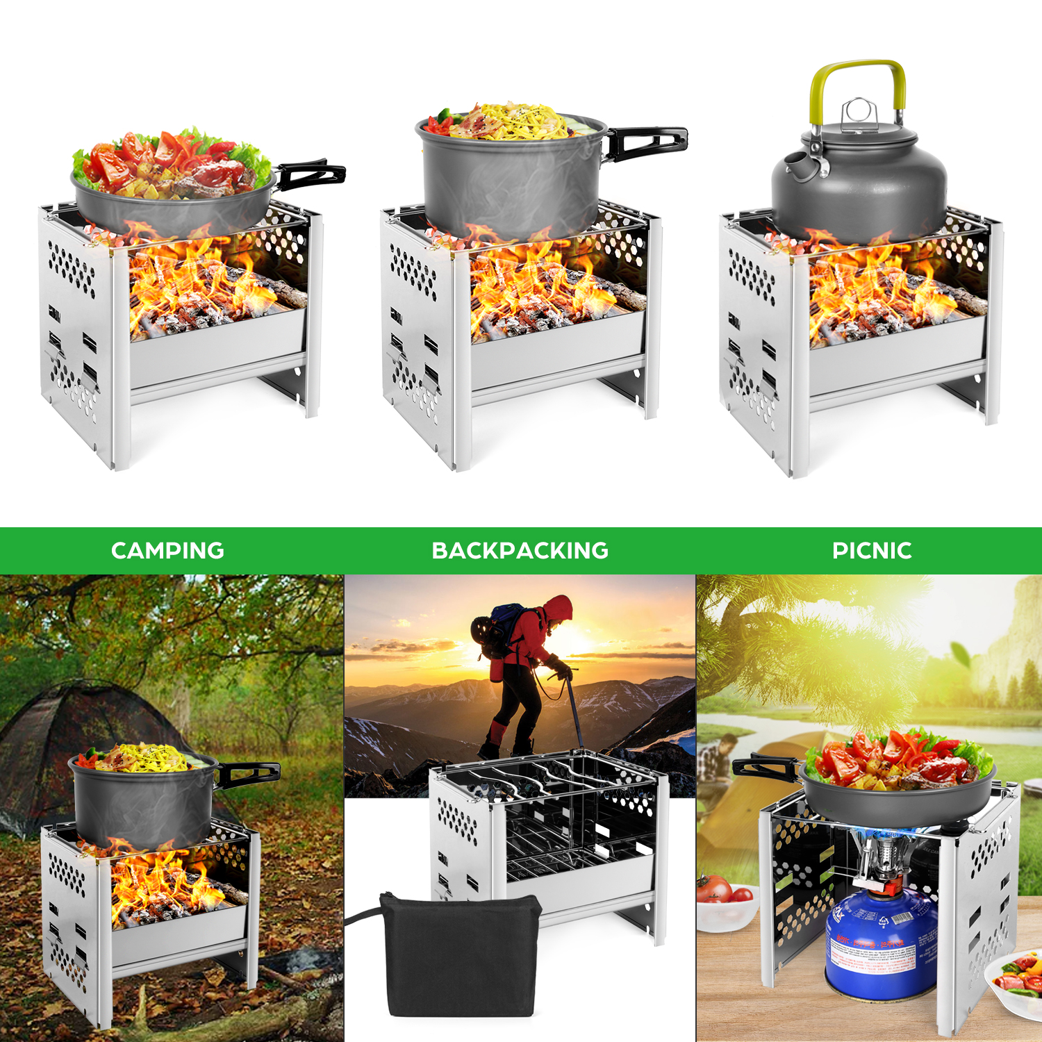 - HIGH THERMAL EFFICIENCY – Pocket bellows and air vents for good ventilation and efficient burning. The secondary combustion keeps camping wood stove burning continued for 20mins with dry firewood and wood chips.